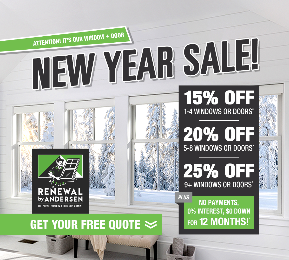 *Offer valid 1/1/26-1/31/26. Financing offer applies on purchases of four (4) or more Renewal by Andersen windows or doors. Financing subject to credit approval. Any finance terms advertised are estimates only. Consumer loan program is provided by various financial institutions without regard to age, race, color, religion, national origin, gender, or familial status. Commercial, multi-family, and contractor projects excluded from offer. Offer subject to change without notice. No cash value. Not valid with any other offer or discount; on existing projects, quotes, repairs, or services; or on prior purchases. Available only at participating locations. Product availability may be limited due to territory restrictions, see your local Renewal by Andersen® of Fargo-Bismarck or Western Products for details.
